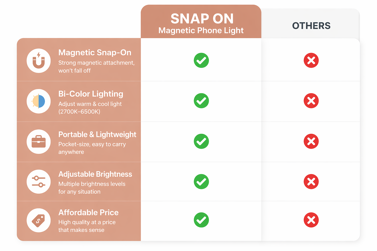 Unlike bulky lights or weak clip-ons, Snap On delivers stable, even lighting with a simple magnetic attachment.